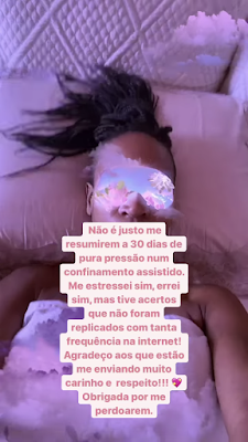 “Não é justo me resumirem a 30 dias de pura pressão num confinamento assistido. Me estressei sim, errei sim, mas tive acertos que não foram replicados com tanta frequência na internet! Agradeço aos que estão me enviando carinho e respeito!!! Obrigada por me perdoarem”, disse.