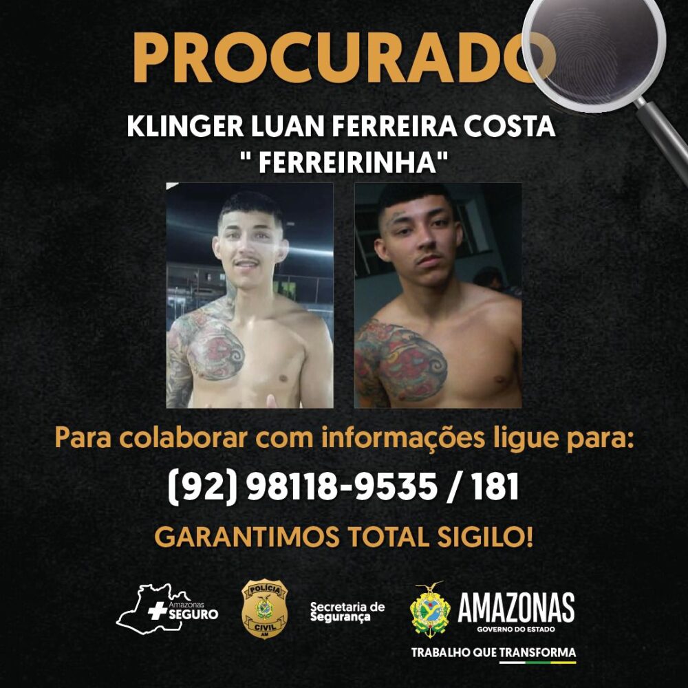 Nesta quinta-feira (29/8), a Polícia Civil do Amazonas divulgou a identidade de três suspeitos que estão sendo procurados por envolvimento no espancamento que resultou na morte do empresário Jones Mota Lopes. Os procurados são Klinger Luan Ferreira Costa, conhecido como “Ferreirinha”, Francisco de Oliveira Galvão Neto e Ayan Ferreira de Souza. As autoridades intensificam as buscas para capturar os envolvidos no crime, que chocou Manaus.