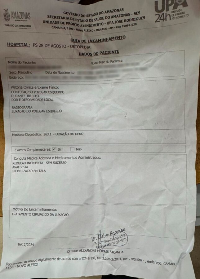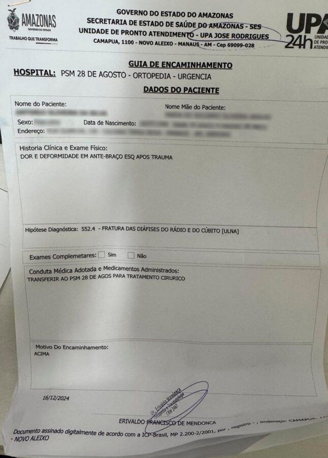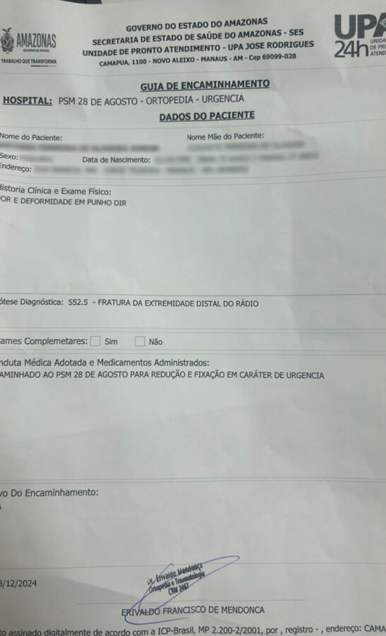 Documentos revelam que médicos do ITO-AM estariam redirecionando pacientes da Unidade de Pronto Atendimento (UPA) José Rodrigues, na Zona Norte, ao Hospital 28 de Agosto, na Zona Centro-Sul, ignorando opções mais próximas, como o Hospital Aristóteles Platão Bezerra (2,5 km) ou o Hospital João Lúcio (7,6 km). A distância até o 28 de Agosto é de 15,4 km.