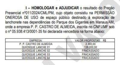 Nos primeiros 20 dias de 2025, a Prefeitura de Manaus iniciou um processo licitatório para concessão de espaços comerciais destinados a lanchonetes no Parque Gigantes da Floresta. O contrato prevê duração de cinco anos e inclui a instalação de quatro quiosques no local. Apesar disso, apenas uma empresa saiu vencedora: a P. P. Castro de Almeida (Sofia Lanches), de propriedade do ex-vereador de Iranduba Pedro Paulo Castro de Almeida, conhecido como “Pepê”, que foi preso em flagrante em 2019 por envolvimento em um esquema de propina.