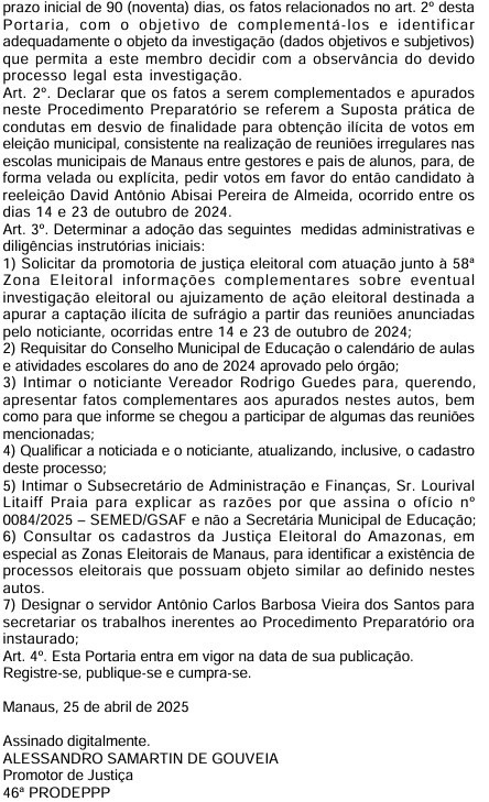 O Ministério Público do Amazonas (MP-AM) abriu investigação contra o prefeito David Almeida (Avante) e sua irmã, Dulce Almeida, ex-secretária da Secretaria Municipal de Educação (Semed), por suposto uso das escolas municipais para obtenção ilícita de votos durante a campanha de reeleição em 2024.