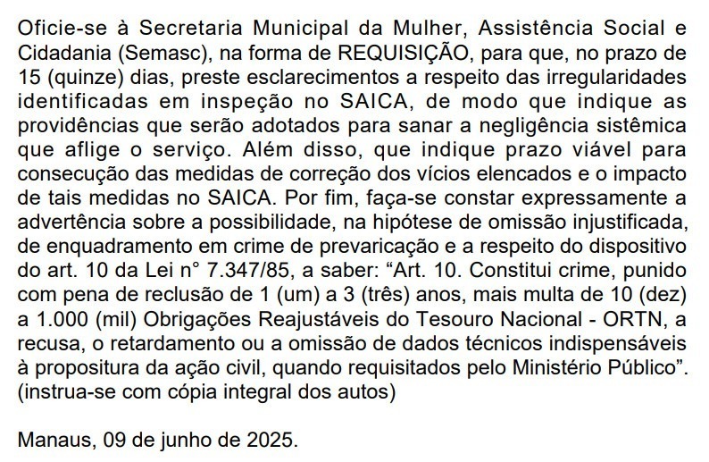 Na última segunda-feira (9), o Ministério Público do Amazonas (MP-AM) oficializou uma investigação, através de um Inquérito Civil instaurado pela promotora Ynna Breves Maia Veloso da Promotoria da Infância e Juventude, contra a Prefeitura de Manaus por denúncias de abandono e negligência no Serviço de Acolhimento Institucional de Crianças e Adolescentes (SAICA).