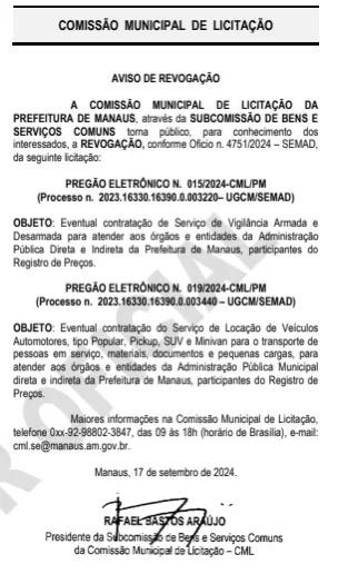 A decisão chama ainda mais atenção porque ocorreu pouco tempo depois da revogação de um pregão eletrônico que previa a contratação de serviços de segurança privada. O edital foi cancelado em setembro do ano passado, sem que a Comissão Municipal de Licitação esclarecesse os motivos.