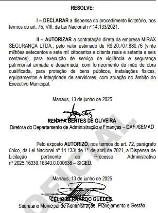 Em mais uma decisão que levanta questionamentos sobre a gestão municipal, a Prefeitura de Manaus firmou um contrato de R$ 20,7 milhões com a empresa Mirax Segurança Ltda., por meio de dispensa de licitação. O contrato foi publicado no Diário Oficial do Município (DOM) na última sexta-feira (13).