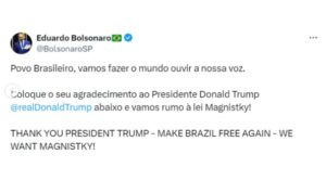 “Obrigado, presidente Donald J. Trump. Espero que as autoridades brasileiras agora tratem esses assuntos com a seriedade que merecem. O Brasil não pode — e não vai — se tornar outra Venezuela, Cuba ou Nicarágua. Deus abençoe os Estados Unidos, Deus abençoe o Brasil”, escreveu Eduardo que em seguida pediu que os brasileiros também agradeçam a Trump.