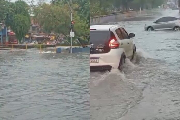 Imagens feitas por moradores mostram veículos tentando atravessar trechos alagados e pedestres buscando abrigo em áreas mais altas. A chuva começou por volta do início da tarde e, em poucos minutos, causou transtornos no trânsito e nas vias de acesso ao bairro.