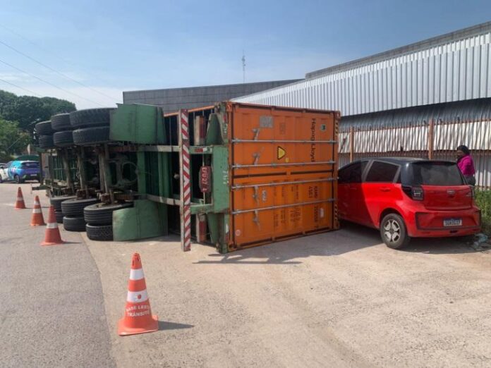 Na manhã desta segunda-feira (10), um contêiner carregado com 25 toneladas de bobinas de papelão se desprendeu de uma carreta e atingiu um carro de passeio na rotatória conhecida como “bola da Gillete”, no Distrito Industrial I, Zona Leste de Manaus. Apesar do susto, ninguém ficou ferido.