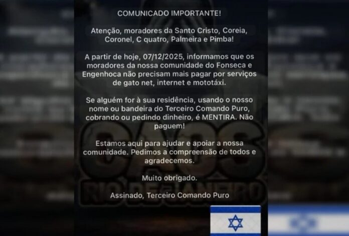 Um comunicado atribuído a integrantes do Terceiro Comando Puro (TCP) passou a circular de forma intensa em grupos de WhatsApp de moradores de áreas dominadas pelo tráfico em Niterói, na Região Metropolitana do Rio. A mensagem, de tom categórico, determina a suspensão imediata de todas as cobranças por serviços dentro de comunidades do bairro Fonseca e adjacências.