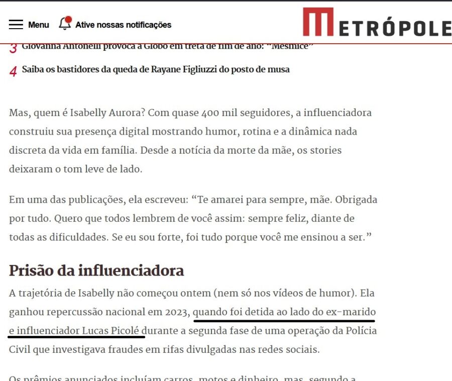 O site Metrópoles cometeu uma gafe ao noticiar a morte da mãe da influenciadora Isabelly Aurora ao afirmar, de forma incorreta, que ela era casada com o influenciador Lucas Picolé. A informação é falsa: o ex-marido de Isabelly é Paulo Victor Monteiro Bastos. O erro ganhou repercussão nas redes sociais e gerou críticas por ter sido divulgado em meio a um momento de forte comoção para a família.