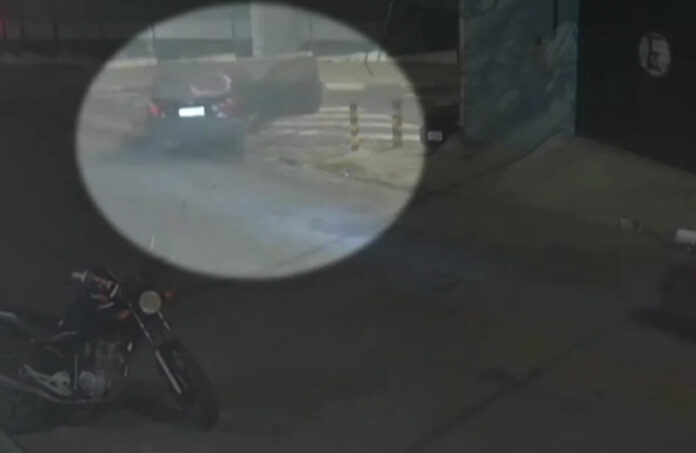 Uma câmera de segurança registrou o momento em que a vítima abre a porta do carro pedindo socorro antes de escapar.