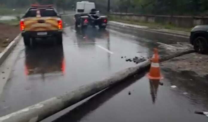 Um poste de energia elétrica caiu na Avenida do Turismo, na Zona Oeste de Manaus, na manhã desta quarta-feira (24), em meio à forte chuva que atingiu a capital amazonense. A ocorrência coincidiu com o horário de maior fluxo de veículos e levou à interdição parcial da via por questões de segurança.