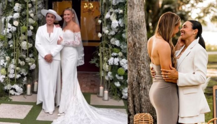 A jogadora brasileira foi levada ao altar pela mãe, Tereza da Silva, e escolheu um look composto por conjunto de calça, blazer e chapéu. Já a norte-americana optou por um vestido branco rendado.