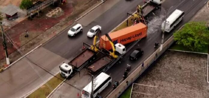 Na manhã desta sexta-feira (9), o trânsito segue lento na rotatória da Suframa, no bairro Distrito Industrial 1, zona Sul de Manaus, por causa do tombamento de um caminhão-carreta ocorrido na tarde de quinta-feira (8). O veículo, que transportava uma carga de tampinhas metálicas avaliada em R$ 9 milhões, ainda não foi retirado e continua bloqueando parte da via.