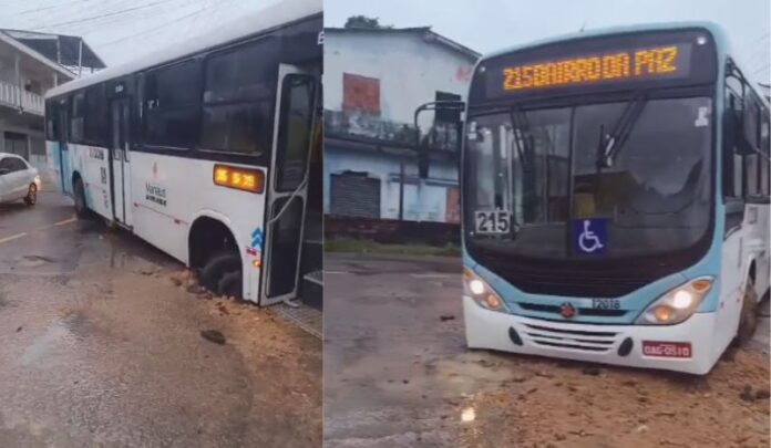 Nesta quarta-feira (25), o forte temporal em Manaus provocou transtornos na malha viária. Um ônibus da linha 215 caiu em um buraco que se abriu entre os bairros Redenção e Bairro da Paz, na zona Centro-Oeste.