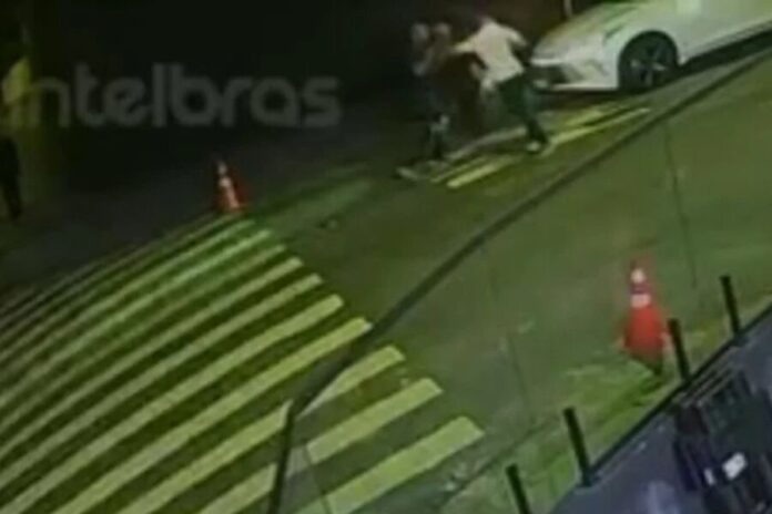 Imagens mostram o motorista agredindo o amigo da vítima, que chega a desmaiar. Em seguida, Jonatas entra em confronto com o condutor. O momento da facada não aparece, mas testemunhas confirmaram o ataque.