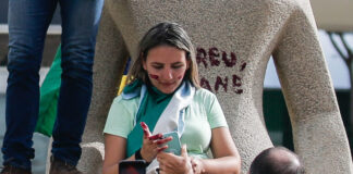 Mulher que usou batom para escrever na estátua durante atos de...