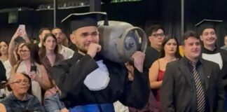 Formando leva botijão de gás como homenagem ao pai durante cerimônia...