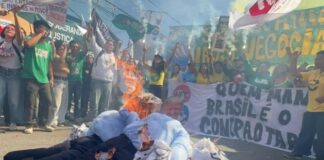 Protesto contra tarifas dos EUA reúne militantes que incendeiam bonecos de...